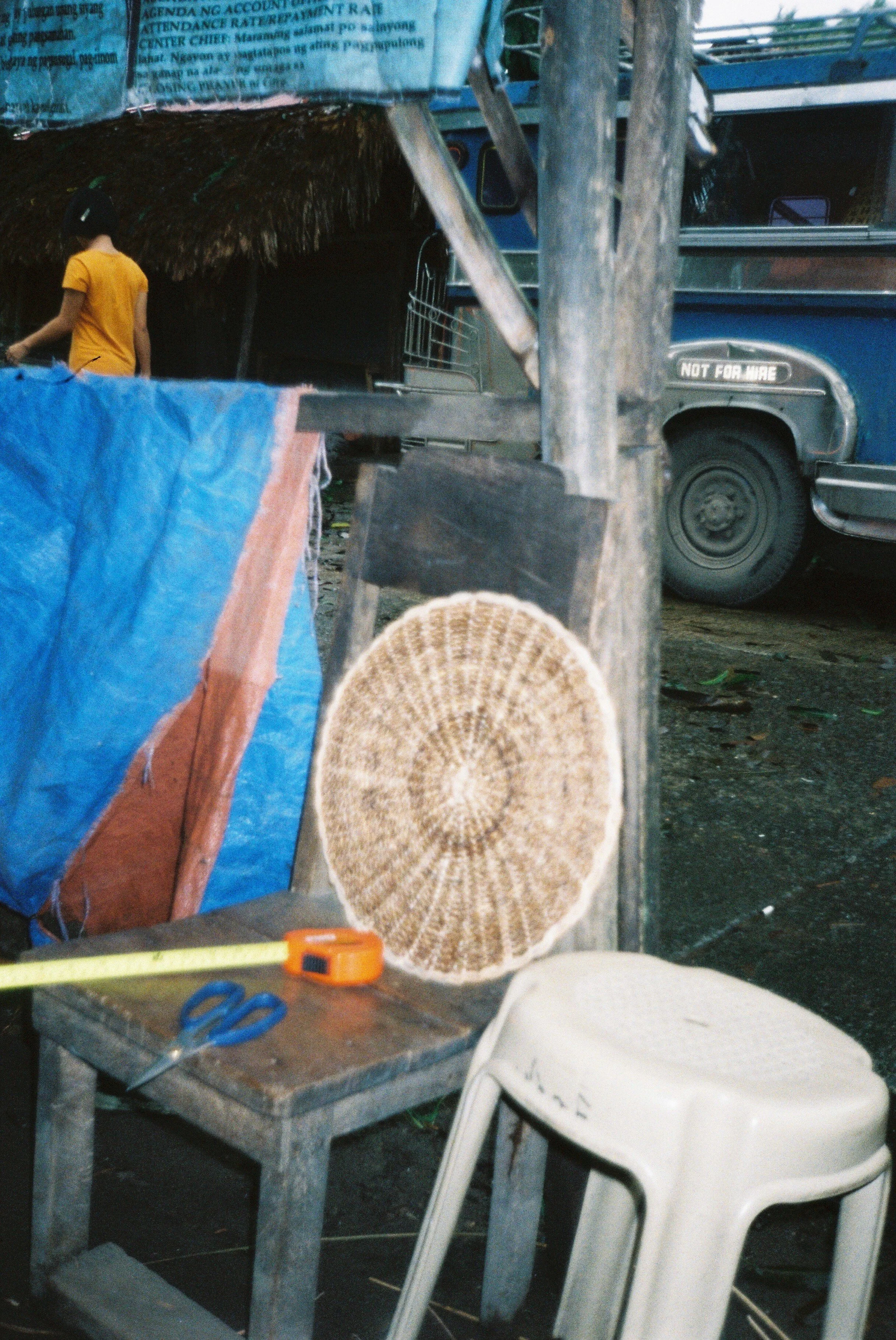 I thought it would be easier for me to start working on flat items, with a simple weave, so I asked Nenita if we could start with this. We made a placemat made of rattan sticks, she told me the material is called wicker. I loved working with it, it has a rounded profile, soft and easy to mould and weave through the spokes. We were able to finish 2— one with all wicker, another one with braided abaca.