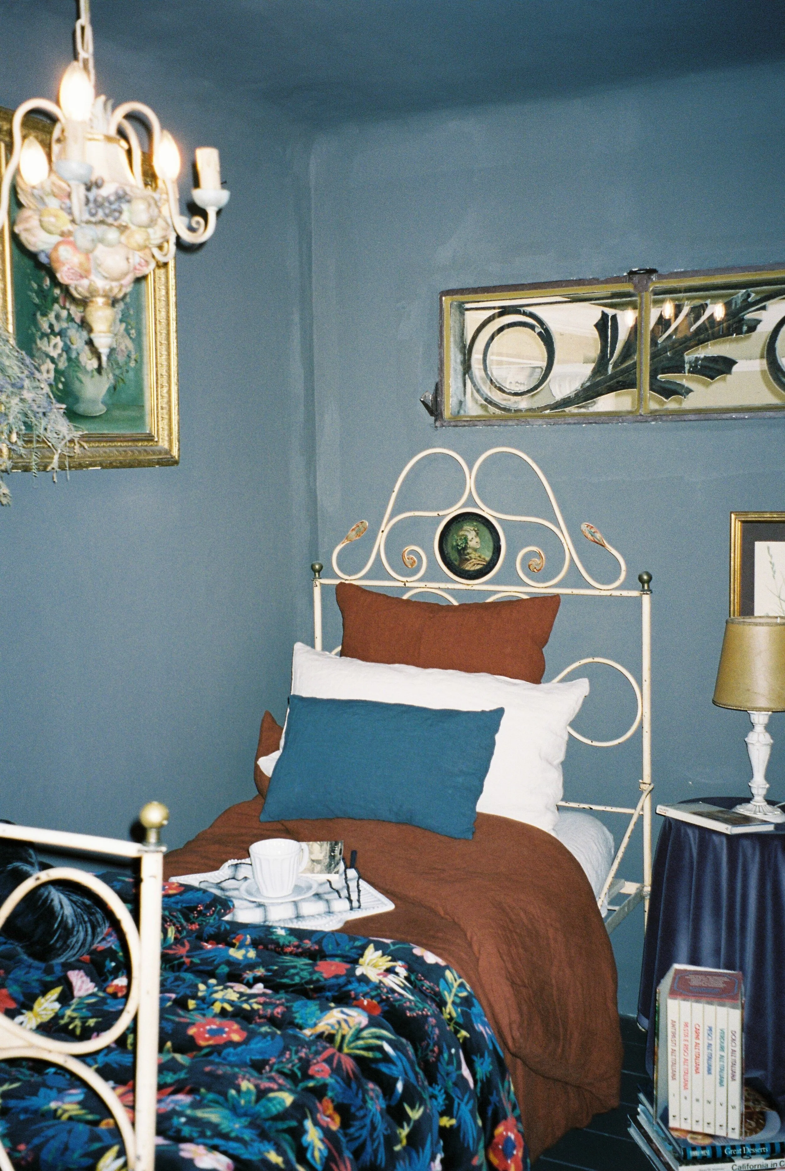 On the upper floor, a single bed was set up in front of a non working fireplace, with patchwork quilts coming from India and Venetian linen sheets. Antique chandeliers were hanging from the high ceiling and a bunch of dried bouquets from the Italian Alps.