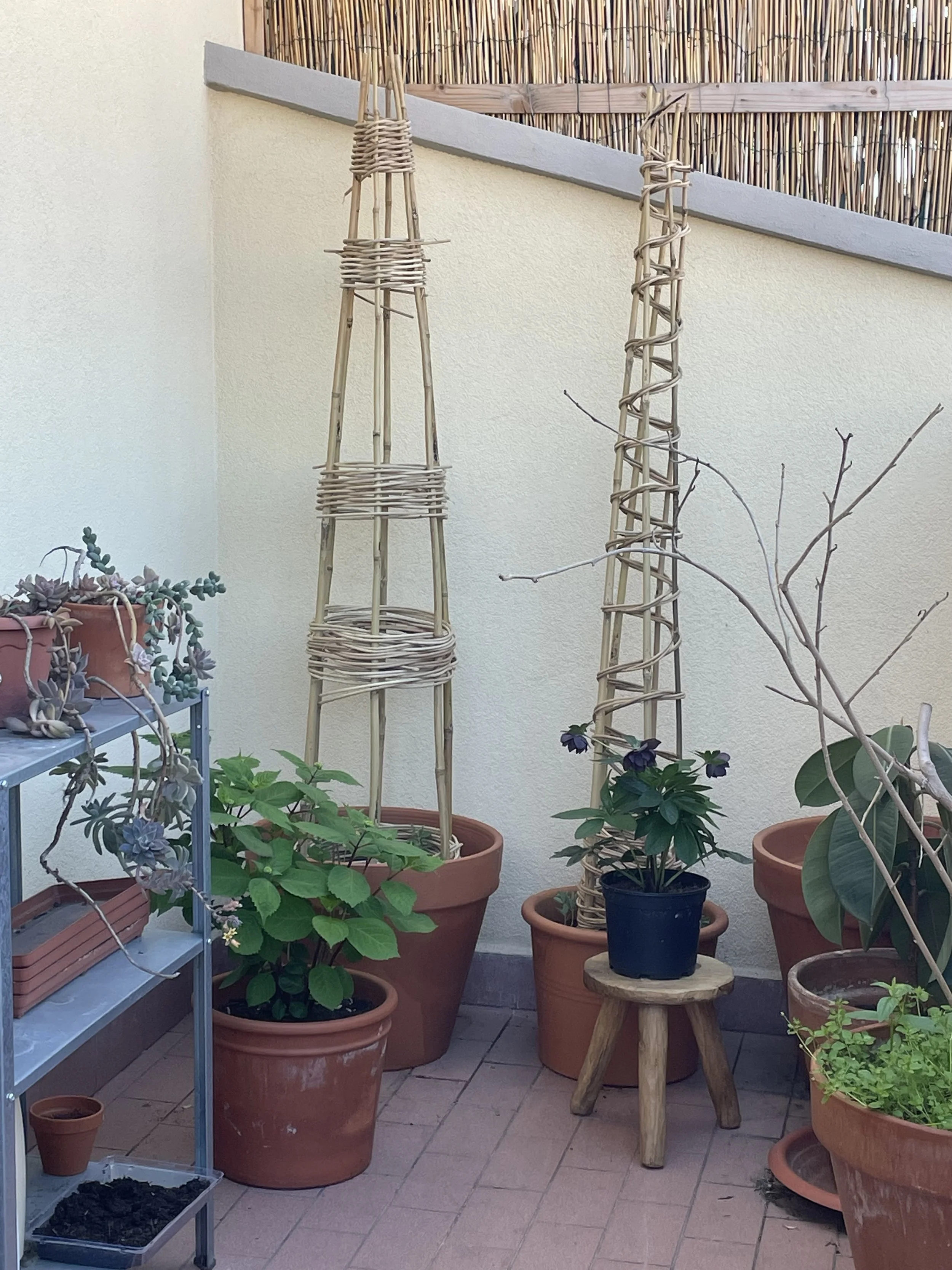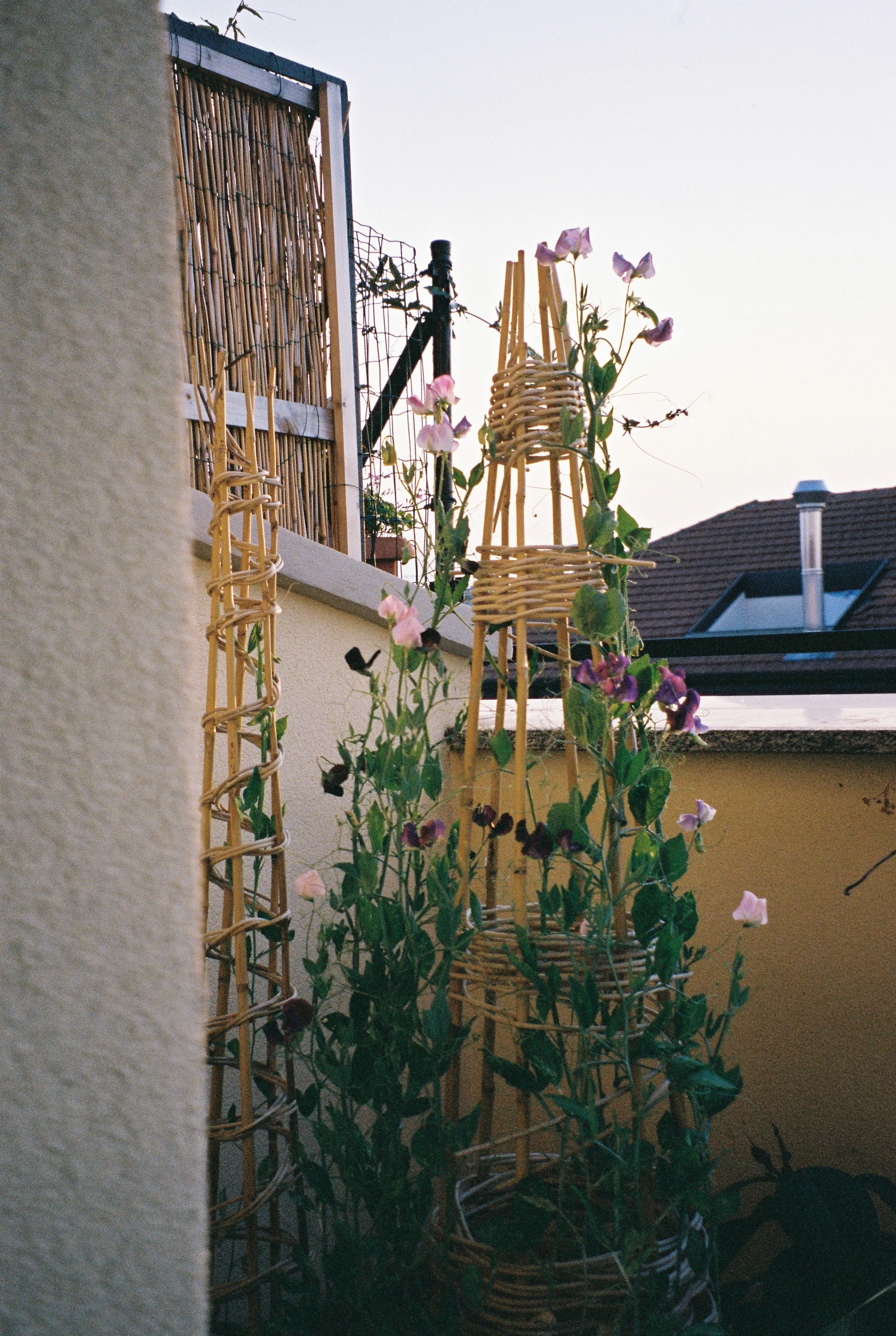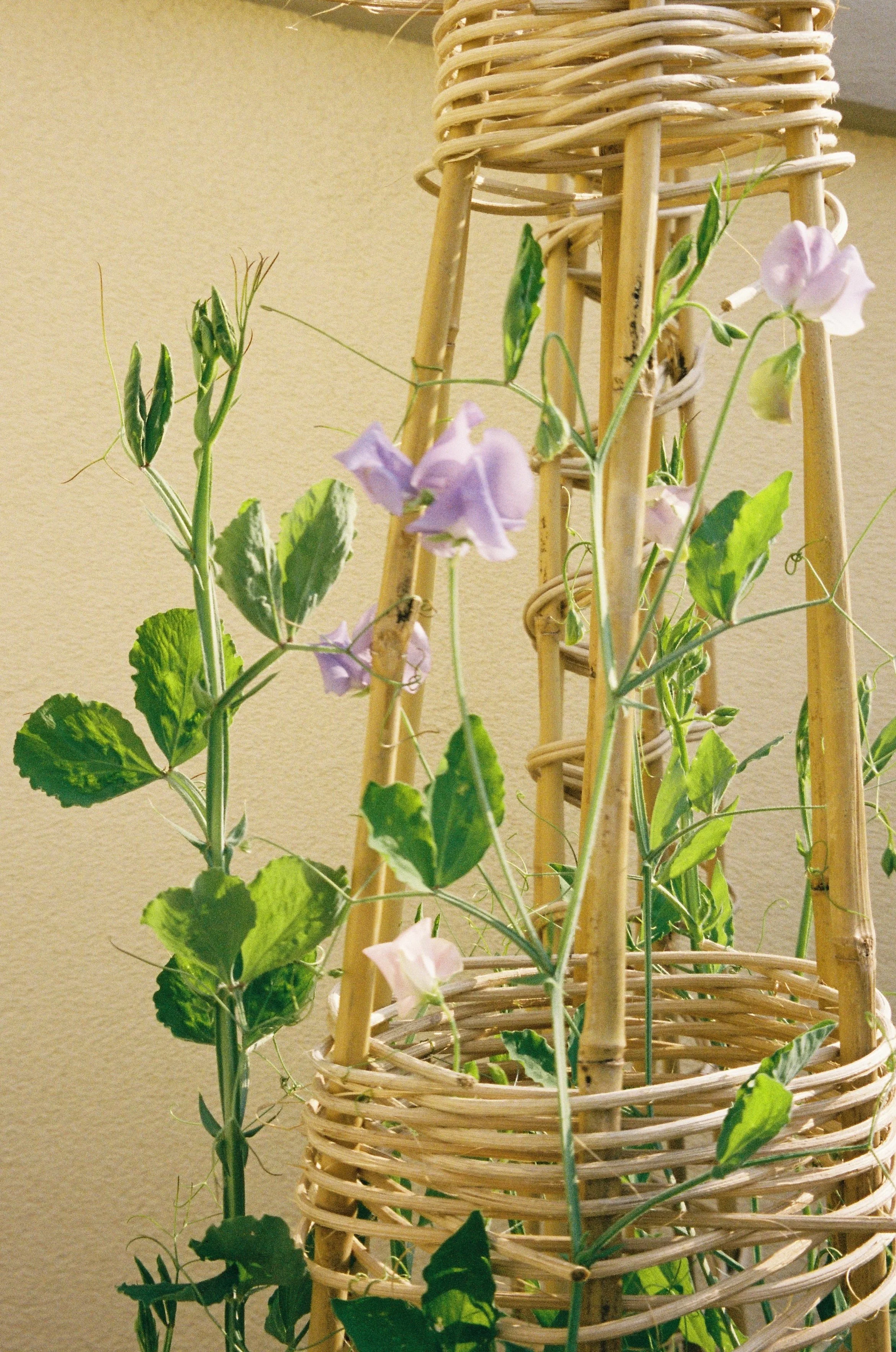 I grew sweet peas out of seeds and made a structure for them to climb on. A trellis? An obelisk? Plant support? Tower? I still don’t know what it is called. I bought bamboo from the garden supply store and woven some rattan that I have at home.