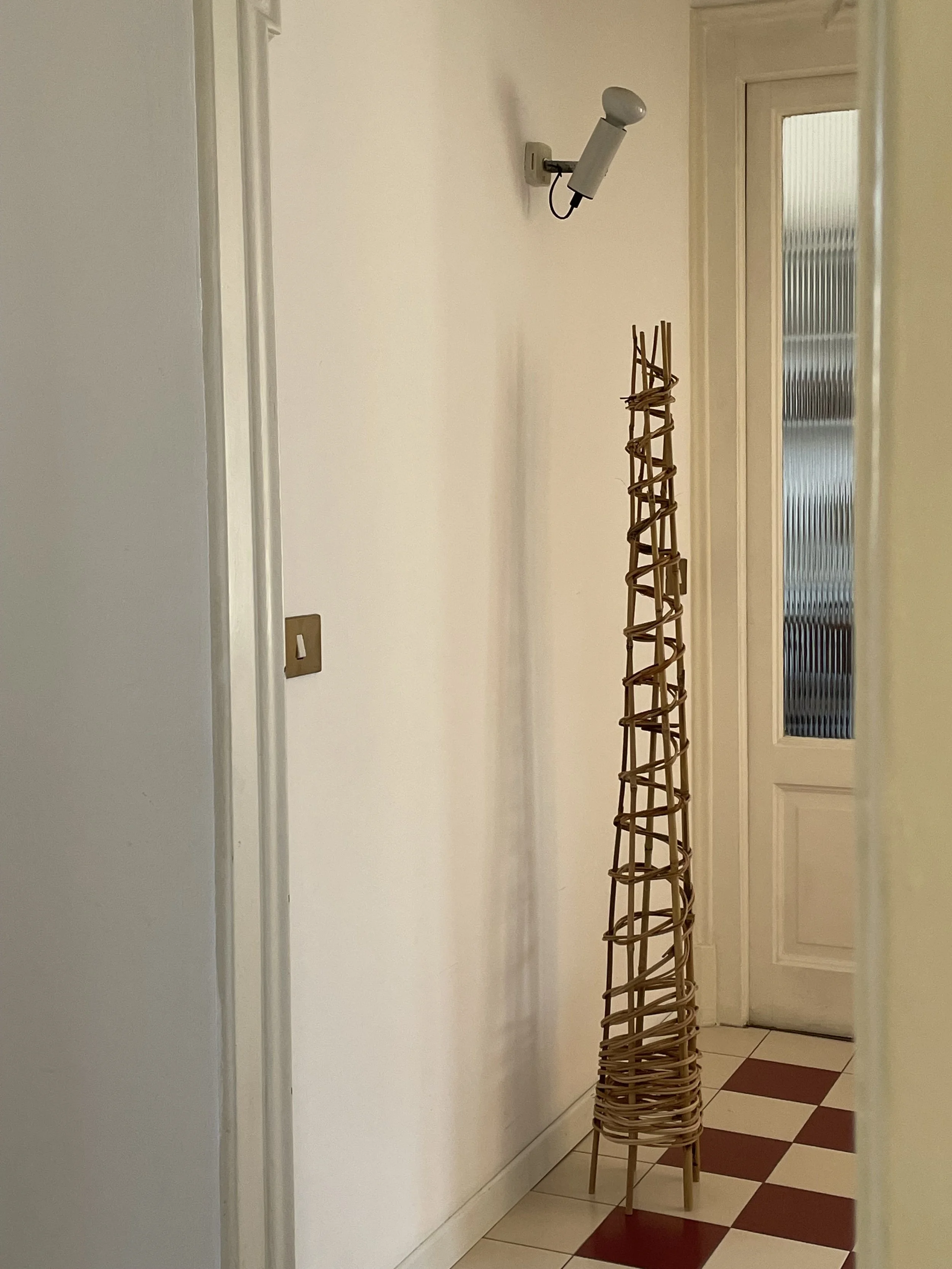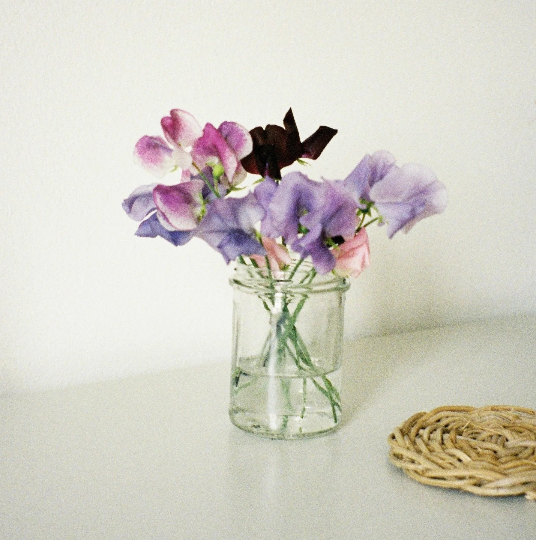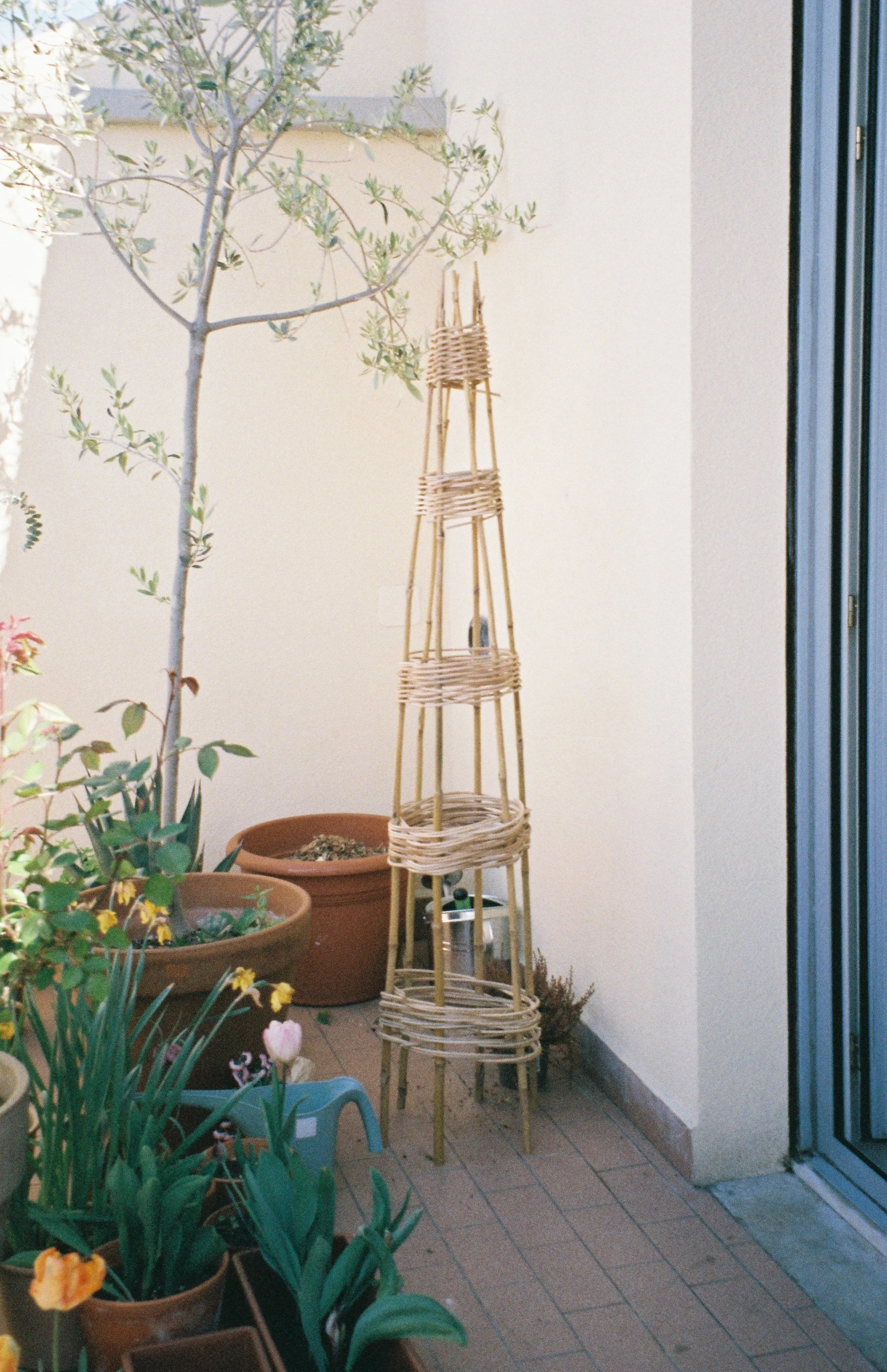 I grew sweet peas out of seeds and made a structure for them to climb on. A trellis? An obelisk? Plant support? Tower? I still don’t know what it is called. I bought bamboo from the garden supply store and woven some rattan that I have at home.